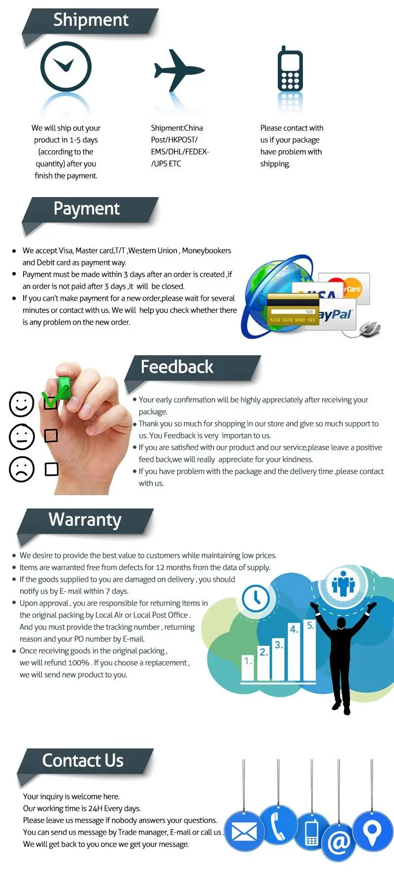 | Servicio Vendedor | Entrega a tiempoSi usted no recibe su compra en 60 días, usted puede pedir un reembolso total del pedido antes de que finalice la orden de finalización (cuando usted acepta "Confirmación de Pedido Recibido" o excede del tiempo de confirmación de la recepción de pedido). |